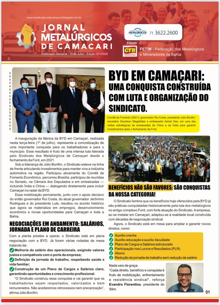 Nesta sexta-feira, 11 de julho de 2025, o Sindicato dos Metalúrgicos de Camaçari entregou seu primeiro boletim oficial na porta da BYD. Um marco que simboliza o início de muitas lutas e, com certeza, de muitas conquistas para as trabalhadoras e trabalhadores metalúrgicos de Camaçari. Juntos, seguiremos firmes na defesa de direitos e na construção de um futuro melhor para todos!
